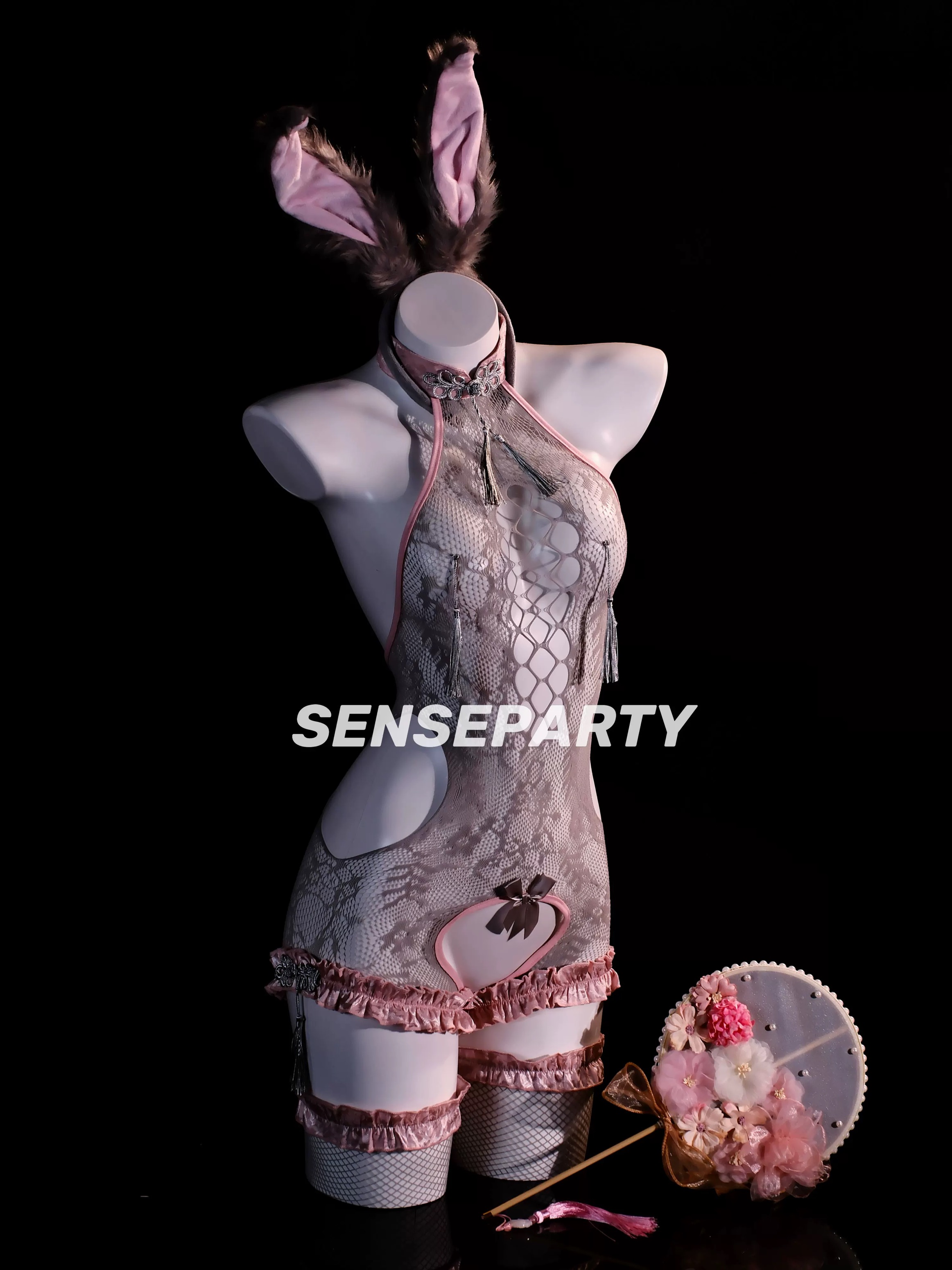 感官派对「性感网兔」兔女郎性感辣妹中式镂空开档纯欲连体衣qqny